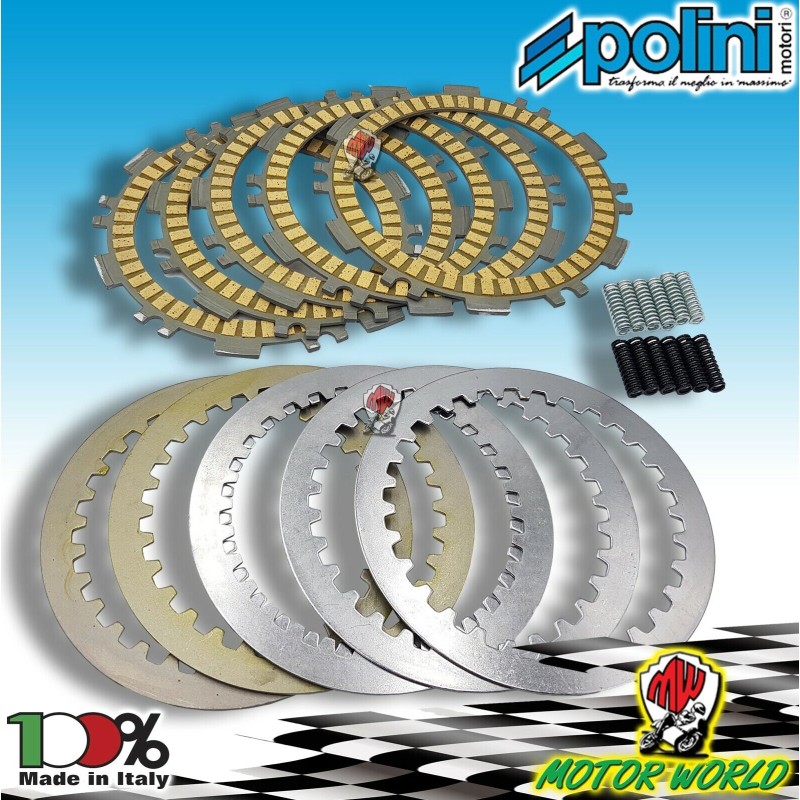 SERIE DISCHI FRIZIONE YAMAHAIl kit frizione è composto da i dischi dotati di supporto metallico e il rivestimento è in materiale d’attrito formulato dopo moltissime prove per adattarsi al meglio alle caratteristiche dello scooter TMax.E’ composto da una mescola di nuove fibre in grado di trasmettere tutta la potenza del motore sopportando le più elevate temperature d’esercizio senza mai accusare cedimenti.Per dare ancora più grinta allo scooter il kit è fornito con due differenti serie di molle di contrasto frizione disponibili in due diversi carichi facilmente riconoscibili per la colorazione: bianco-zincato e giallo-zincato.Si tratta di un kit studiato per migliorare ed ottimizzare le prestazioni dell’attacco frizione ed aumentare il numero d’innesto dei giri motore.Molle di colore bianco-zincato: attacco frizione 3000 giri/min, pattinata frizione 5500 giri/min.Molle di colore giallo-zincato: attacco frizione 3200 giri/min, pattinata frizione 5800 giri/min.Il kit frizione Polini assicura una migliore erogazione a ogni regime di giri, partenze e spunto brucianti senza penalizzare la modulabilità della frizione.Offre un’ottimizzazione costante della trasmissione anche quando la frizione è sottoposta a lunghe e gravose sollecitazioni.
